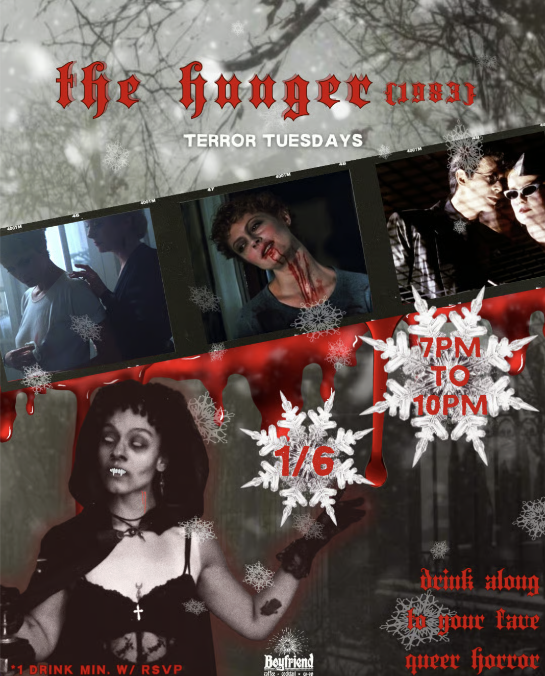 the whimsy and macabre are encouraged! come dressed as you desire, but remember that halloween doesn't have to end in October. this event series is an opportunity for queer and trans horror fans to hoot and holler over our favorite queer horror! Whether you get a well drink or a mocktail, there's a ONE drink minimum. First 25 bloodsuckers get a themed pin <3 1/6- THE HUNGER (1983) 2/10- Vampire trivia 3/24- FRIGHT NIGHT (1985) *Each film is paired with a queer, horror short film by local and international filmmakers While the event is free, consider donating to Immigration Equality with your ticket or day-of