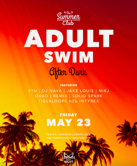 Legends of The Night and Summer Club Present: Adult Swim, an exciting concept showcasing NYC's top rising talent at the best pool party in the East Coast. Stay Late Night! We go until 12AM. DJs from 4pm-12AM Lineup A-Z 4YU DJ NAVA JAKE LOUIS NIKJ QUAD REMIX SOLID SPARK TIGERLOOPS b2b INTYREX Avatar